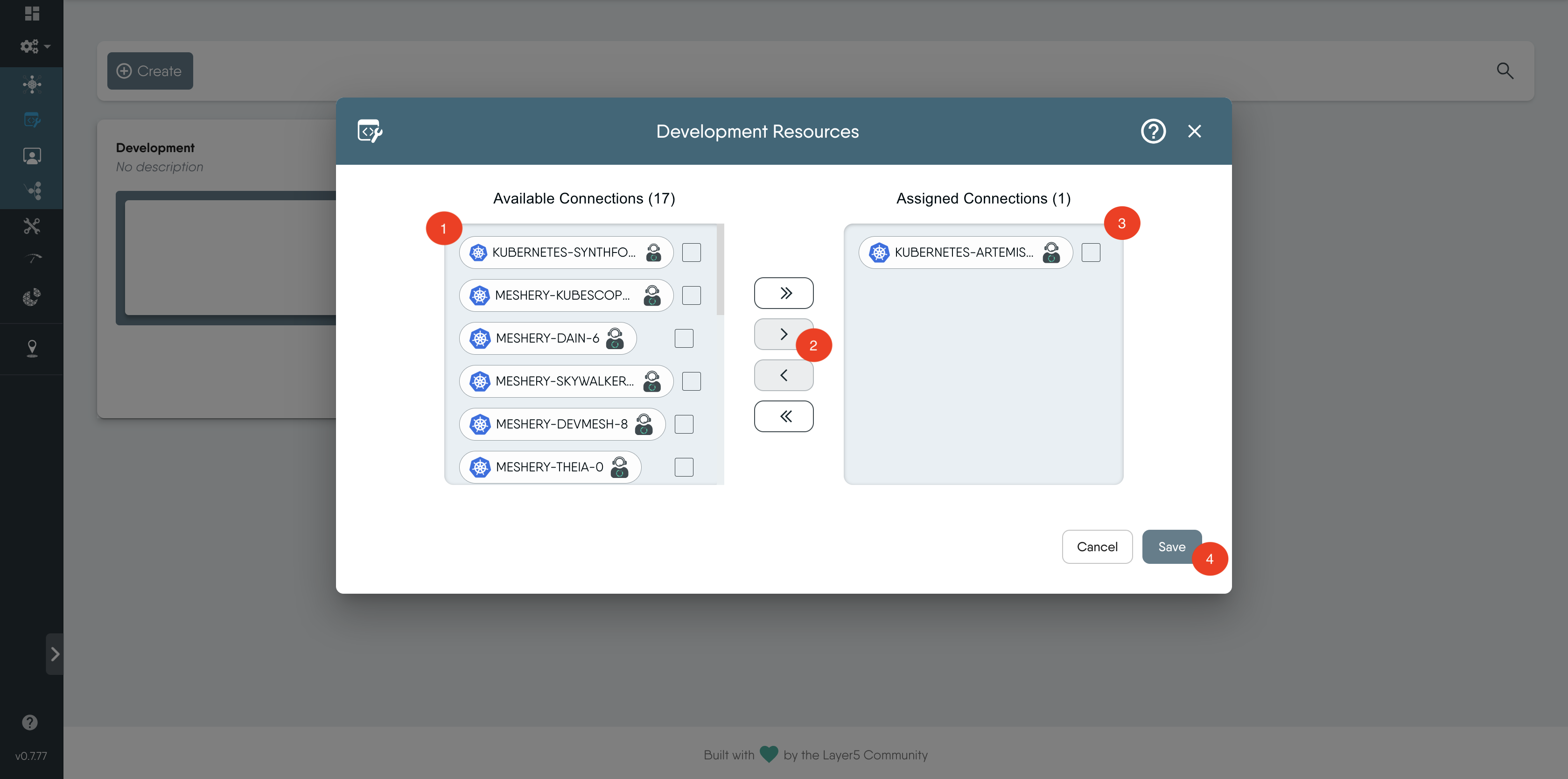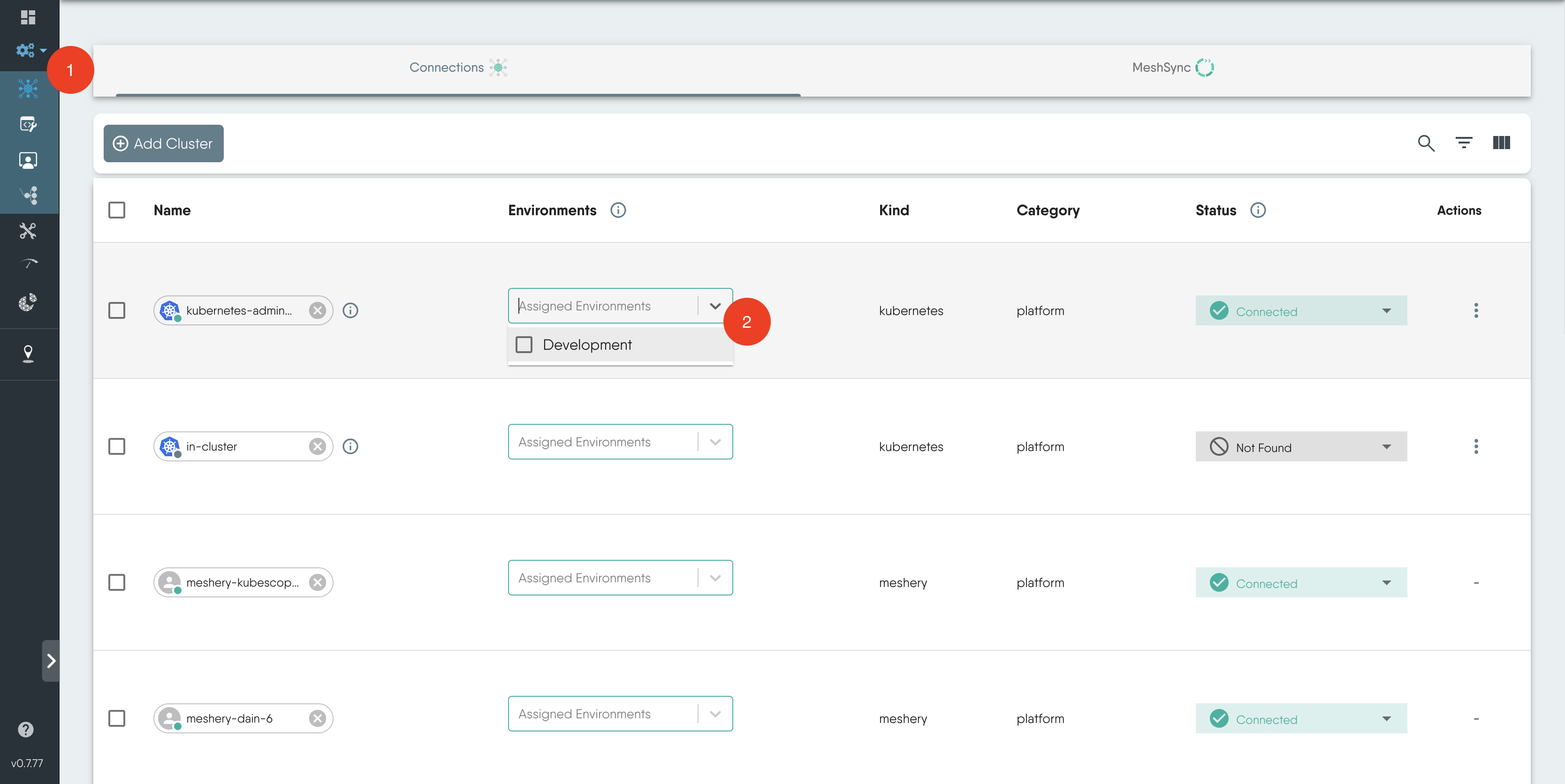 Add Kubernetes Connections: If you do not have any Kubernetes connections available, refer to this documentation on how to manage your clusters with Meshery: Managing Kubernetes Clusters with Meshery.